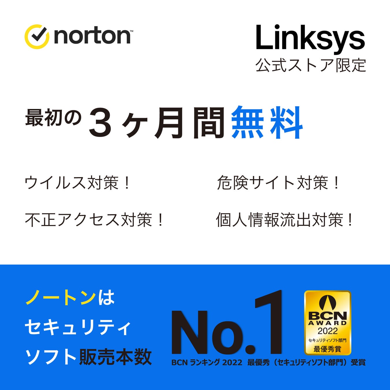 Linksys E9450 EasyMesh対応WiFi 6ルーターをノートン製品と組み合わせれば、インターネットのセキュリティは万全です。3か月間無料でノートンのセキュリティ機能を使用できるので、安心してウェブサーフィンを楽しめます。ノートンの高度なセキュリティ機能が、ウイルスやマルウェアなど、オンラインの脅威からデバイスを守ってくれます。個人情報や機密データが流出する心配もなく、しっかりと保護された安全な通信環境でインターネットをご利用いただけます。無料試用期間の終了後も、手頃な料金でノートンセキュリティの利用を継続できるので、安全で安心なオンラインエクスペリエンスを維持できます。
