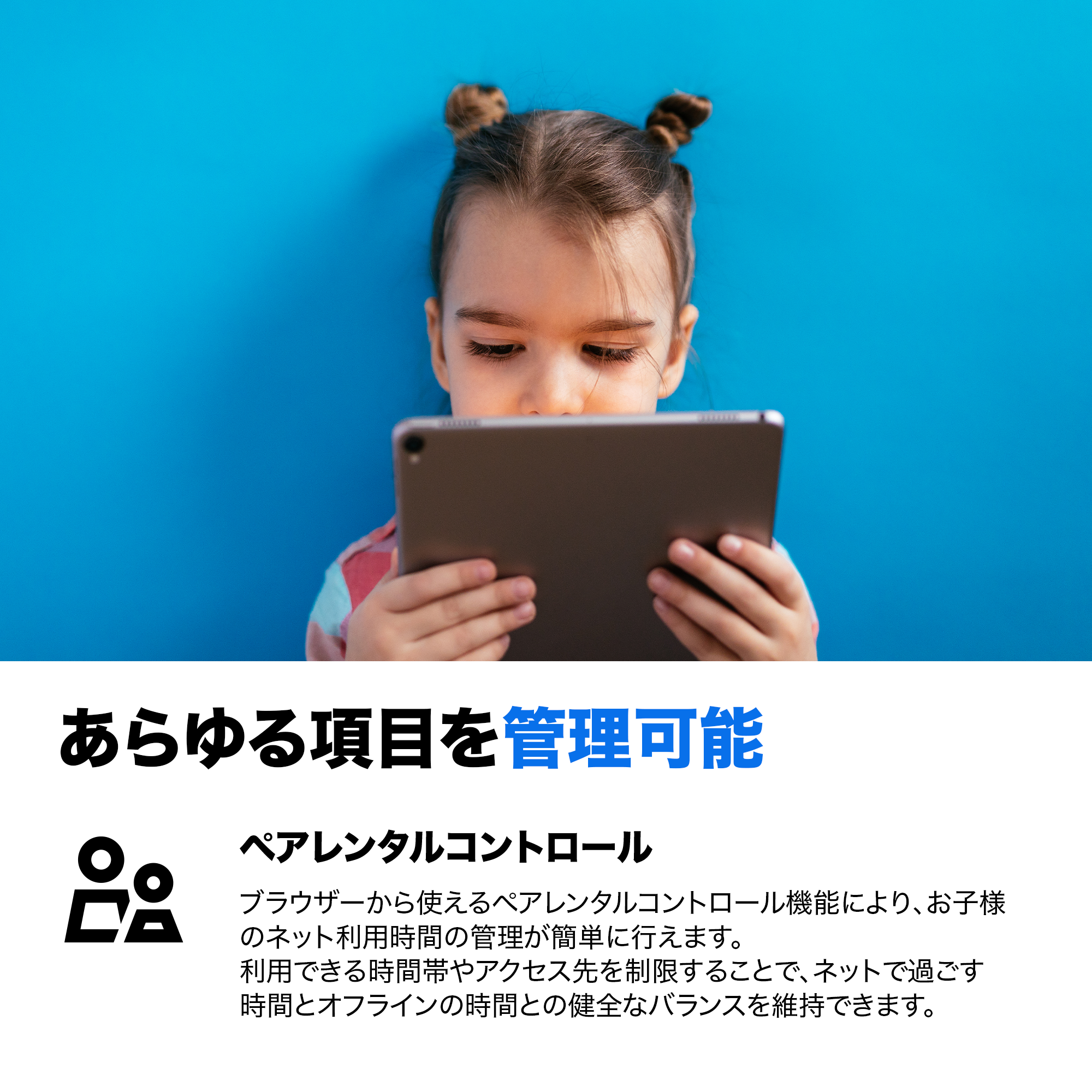 より多くのデバイスをホームネットワークに接続できるようになった今、閲覧できるコンテンツやネットの利用時間を管理することが非常に重要です。Linksys E9450 EasyMesh対応WiFi 6ルーターは、ペアレンタルコントロール機能を備え、インターネットにアクセスできる時間帯の制限が可能です。お子様の健全なデジタルライフのためにインターネットの利用を制限し、家族全員が安心して使える通信環境を構築することができます。