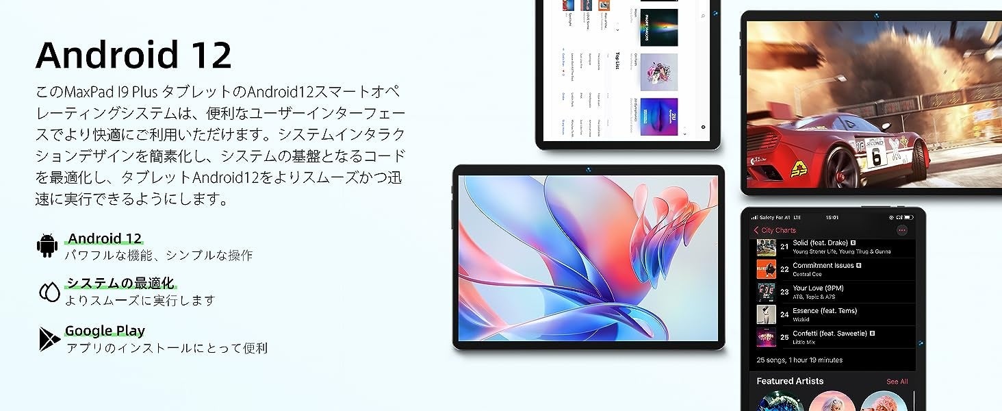 MaxPad I9 Plus タブレットは、最新のAndroid 12システムを搭載し、アプリの起動や切り替えが従来よりも速くなり、タブレットをより快適に操作できるようになります。新しいデバイスへの移行も従来より簡単です。安定したスムーズなGoogleサービスを体験するだけでなく、LINE/YouTube Kids/Yahoo/Twitterなどのお気に入りのサードパーティアプリケーションをインストールすることもできます。