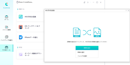iCareFoneを利用して、PCにあるHEIC写真を簡単かつ素早く「.JPG」に変換します。フォルダを選択し、一括変換することもできます。一度に1,000枚までの写真を変換可能です。