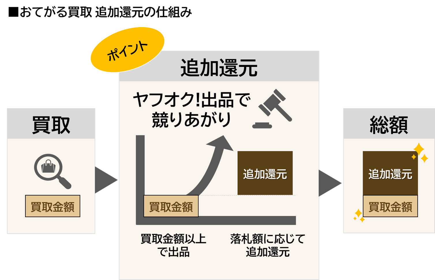 本サービスは、RECLO社がユーザーの不要になったブランド品やジュエリーを買い取り、追加還元の条件を満たした商品を真贋鑑定を行った上で「ヤフオク!」に出品します。「ヤフオク!」で落札された金額に応じて後日、還元額をユーザーに追加で支払うことで、買取金額が実質最大で5倍になります(※)。本サービスのLINE公式アカウントで査定の申込から集荷など各種手続きが完結するため、煩雑な手続きは必要ありません。査定と商品の送料も無料です。