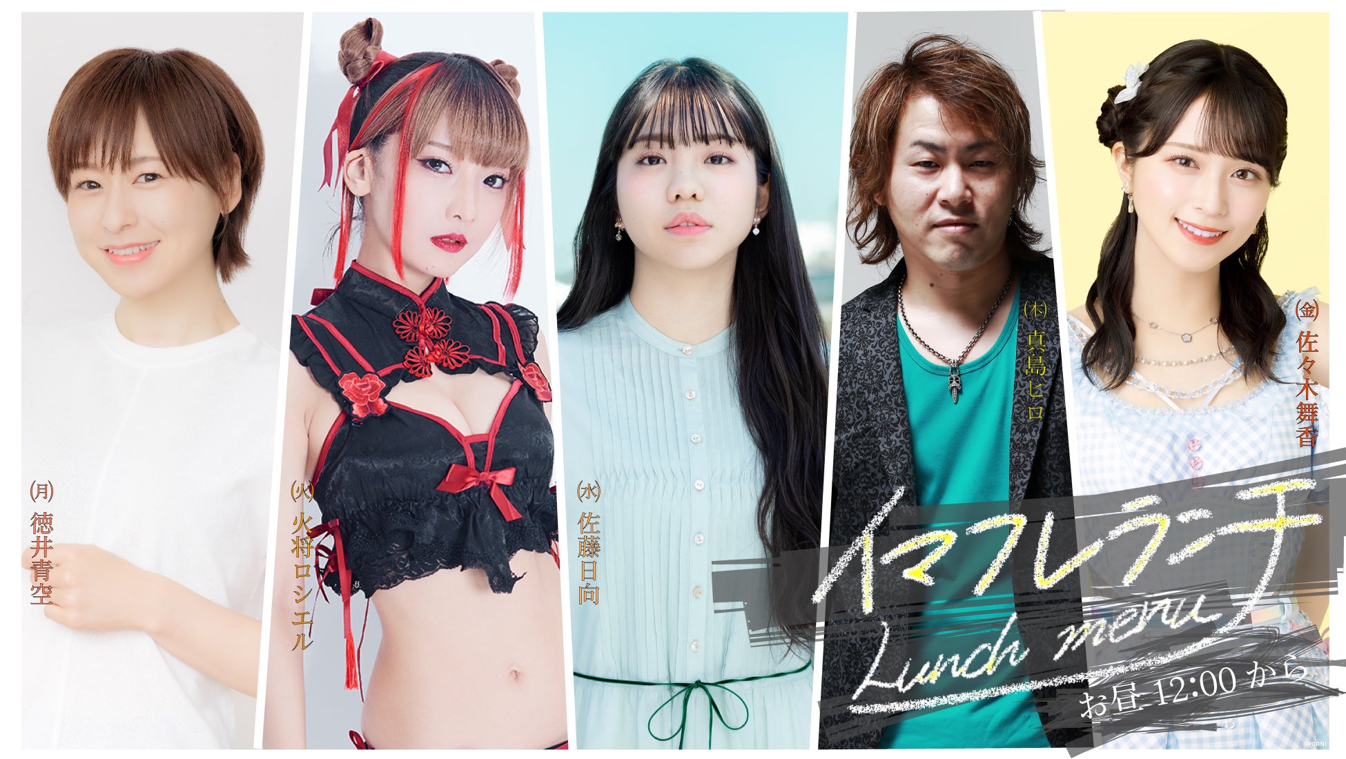 真島ヒロ(漫画家)、徳井青空(声優・漫画家)、火将ロシエル(プロコスプレイヤー)、佐藤日向(声優・女優)、佐々木舞香(=LOVE)といった、推し文化を象徴するジャンルから各界で活躍中の面々がお昼12:00に集合。リスナーのイマジナリーフレンド(空想上の友達)となり、聴覚を起点に未体験のランチタイムに誘う。