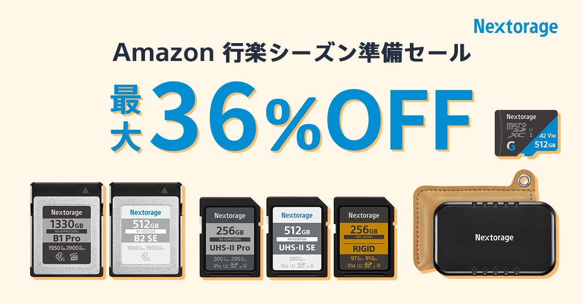 今回のセールでは、撮影機会の増える秋の行楽シーズンに向け、メモリーカード、ポータブルSSDを用意しました。クラス最高レベルの転送速度を持つCFexpress Type Bメモリーカード「NX-B1PROシリーズ」が最大36%OFF、外出先でのデータ保存に便利な小型軽量かつ、高速データ転送が可能なポータブルSSD「NX-P2SE2TB」が15%OFFなど、撮影から保存まで、ワークフローを快適にする24製品をお求めやすい価格でご提供します。