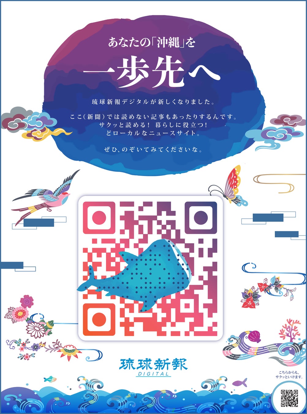 琉球新報社は、沖縄県民とともに歩む「県民共創」の随一のメディアとして、沖縄県民の幸福の最大化を掲げて新しく生まれ変わります。リニューアルのテーマは 〈あなたの「沖縄」を一歩先へ〉 。紙の新聞制作で培ってきた取材力や、沖縄を深く知ろうとするローカルに徹した視点を生かし、読者と共に沖縄の未来を創るニュースメディアを目指します。※リニューアルの詳細については下記のジンベイザメのQRコードからご参照ください。