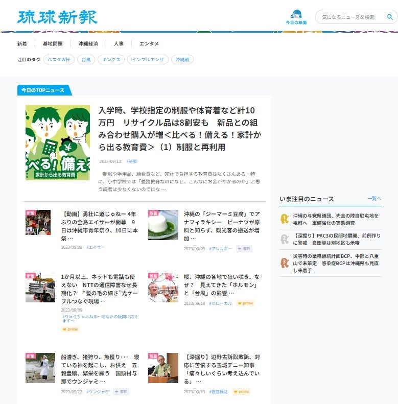 新たなサイトのデザインは、沖縄をイメージさせるさわやかな青を基調にしました。琉球新報のキャラクター「りゅうちゃん」の色合いをちりばめた紅型風の帯をサイトトップに配しています。
