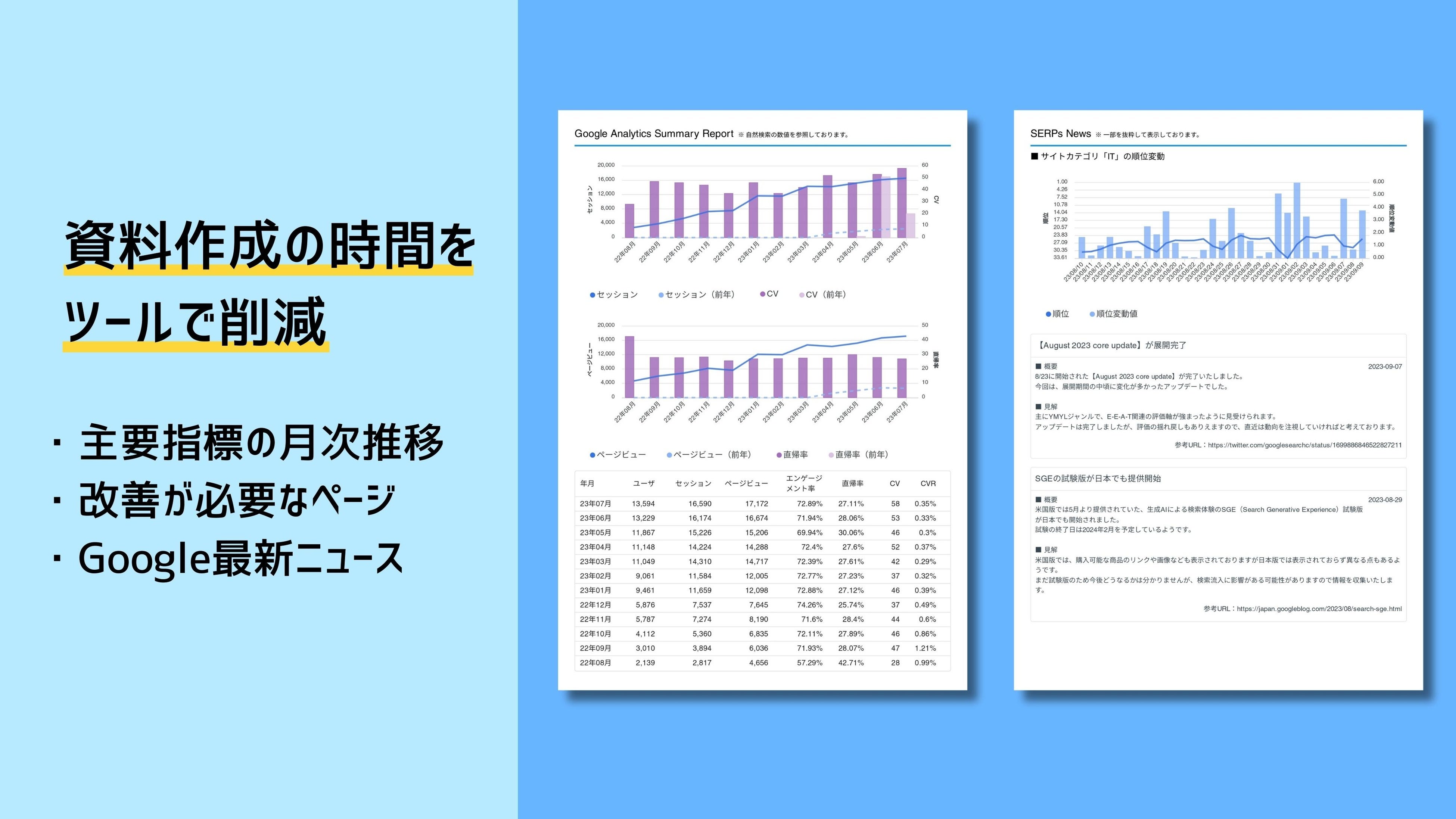 新機能「CANALYレポート」では、サイト分析の重要ツールであるGA4とGoogleサーチコンソールを掛け合わせた分析を自動で行います。分析結果はPDFファイルとして出力でき、そのまま社内の報告資料としてお使いいただけます。