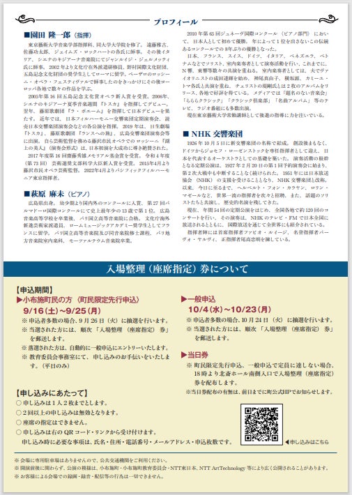 また、小布施町民先行申込、一般申込で定員に達しない場合のみ、2023年11月2日(木)18:00より北斎ホール南側入り口で当日券を配布します。