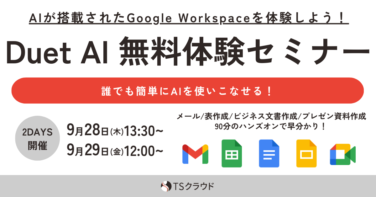 本セミナーは「AI が搭載された Google Workspace を体験しよう!」をテーマに、Google Workspace を導入している企業を対象にした体験型のハンズオンセミナーです。