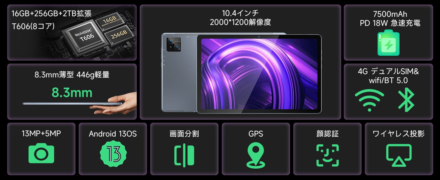8コアT606CPU/ Android 13 /10.4インチ /2K FHD/4G LTE/ 16GB(8GB+8GB仮想)RAM+256GB +1TB拡張可能/ 13MP+5MP/7500mAh