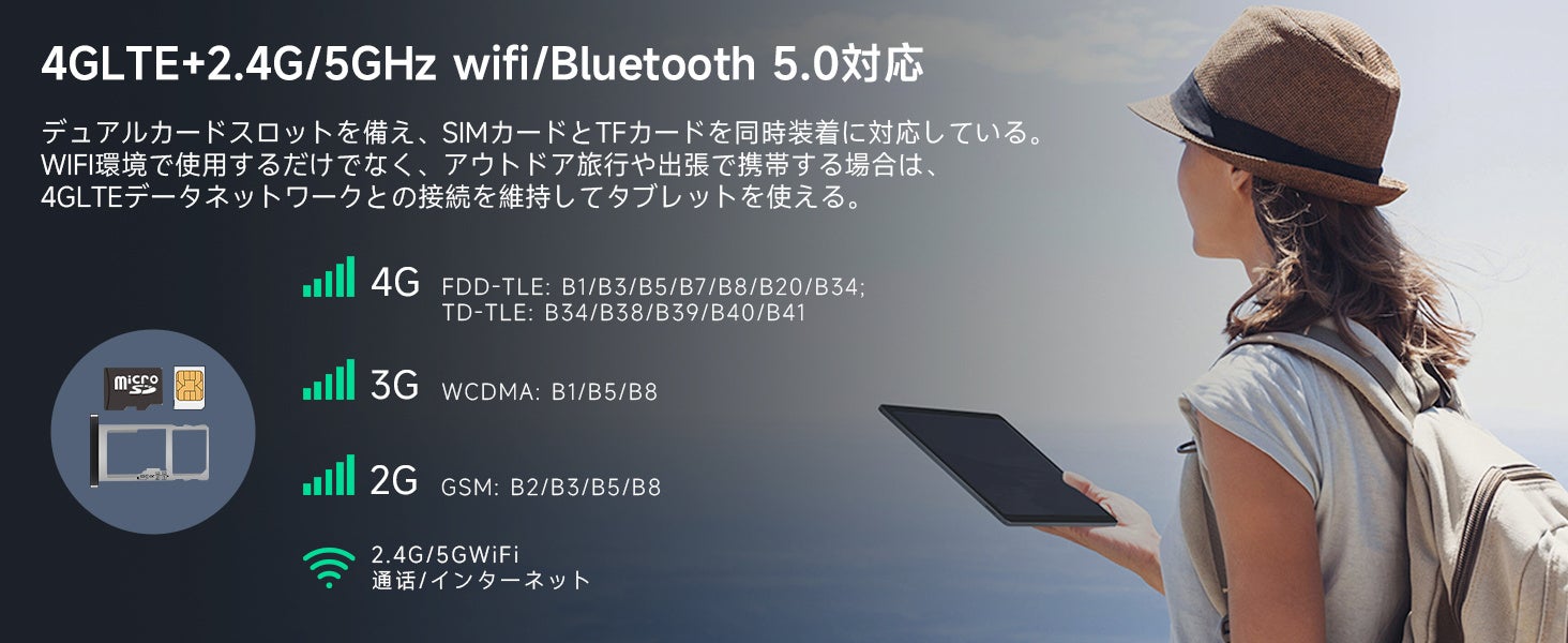4G LTE通信に対応可能、SIMスロットはデュアルnano-SIMカードに対応できます。さらにBMAX Android 13タブレットには最新のBluetooth 5.0 が付属しており、お気に入りのアクセサリー全てに接続でき、データ転送速度が向上し、ネットワーク遅延が短縮されております。