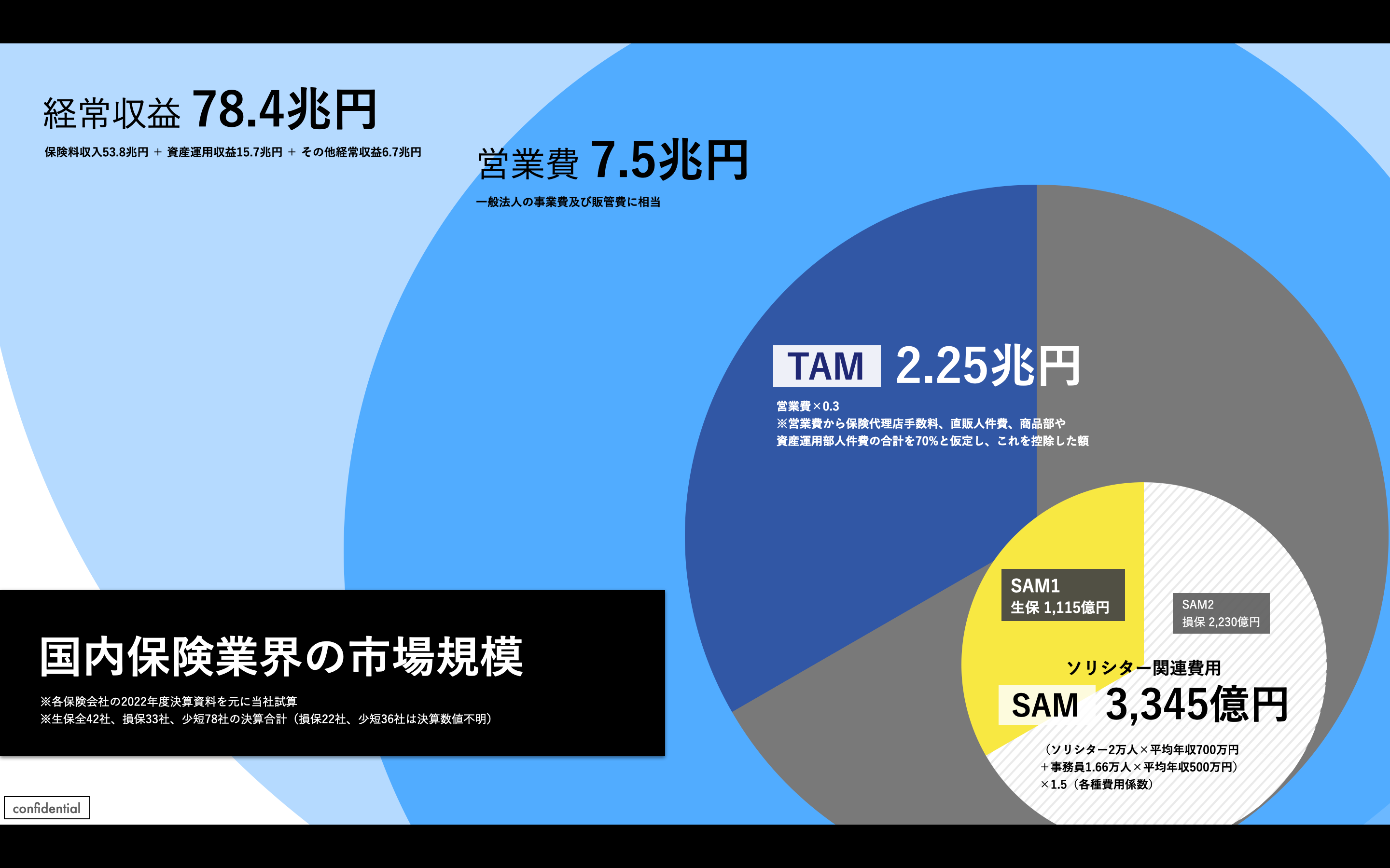 国内保険業界の経常収益は78.4兆円の巨大市場です。営業費7.5兆円の30%に相当する2.25兆円をTAMと定義し、ソリシター関連費用3,345億円をSAMと定義しています。