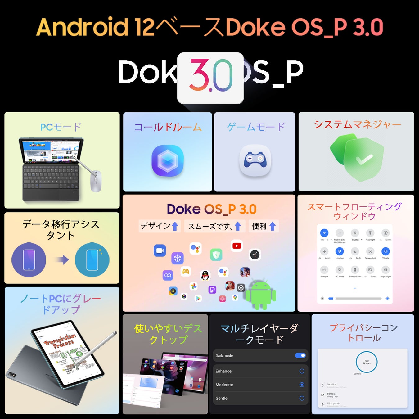 Blackview Tab16 タブレット11インチには最新のAndroid12が搭載されており、よりパーソナライズで安全かつ操作しやすいシステムエクスペリエンスを提供する。ユーザーはUIの配色やウィジェットなどを自由自在にカスタマイズすることができる。また、クリックやスワイプ、スクロールもよりスムーズに行えるようになった。スクリーンショットやフローティングウィンドウアニメーションを、人間が滑らか感じられるようDokeOS_P 3.0 でブラッシュアップしています。Doke OS_P 3.0は、見落とされがちな操作にも着目。アプリのグループ化やフォルダの解除、レイアウトロック、アイコンのカスタマイズなど簡単に行うことができます。バッテリー残量や音量警告、USB接続時や通話中のガイドなど、かゆいところに手が届くOSです。