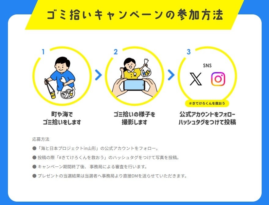 特設ページ【https://uminohi-kitekerokun.jp/】にて「ごみに埋もれているきてけろくんを救おう!」みんなの投稿で少しづつきてけろくんが埋もれているごみがなくなります。ごみが全部無くなると本イベント限定デザインのきてけろくんが登場します!参加方法は”海と日本プロジェクトin山形”のSNS公式アカウント(公式X(旧Twitter)【https://twitter.com/yamagata_umi】、公式Instagram【https://www.instagram.com/umi_yamagata/】)をフォロー。ごみ拾いをした写真をX(旧Twitter)もしくはInstagramにて「#きてけろくんを救おう」を付けて投稿!投稿者の中から抽選で由良温泉ホテル八乙女の宿泊券やオリジナルデザインのきてけろくんのCFBコラボグッズが当たります!1人何度でも、もちろん毎日でも投稿可能です。みんなでごみ拾いをして山形を綺麗にしよう!