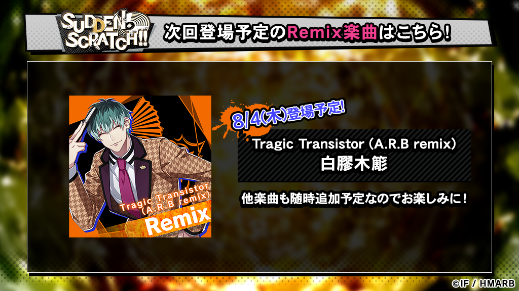 8月4日(木)から開催が予定されているSUDDEN SCRATCH!!では、「Tragic Transistor(A.R.B remix)」が登場予定!他キャラクターのRemix楽曲予定も随時追加を予定しておりますのでお楽しみに。