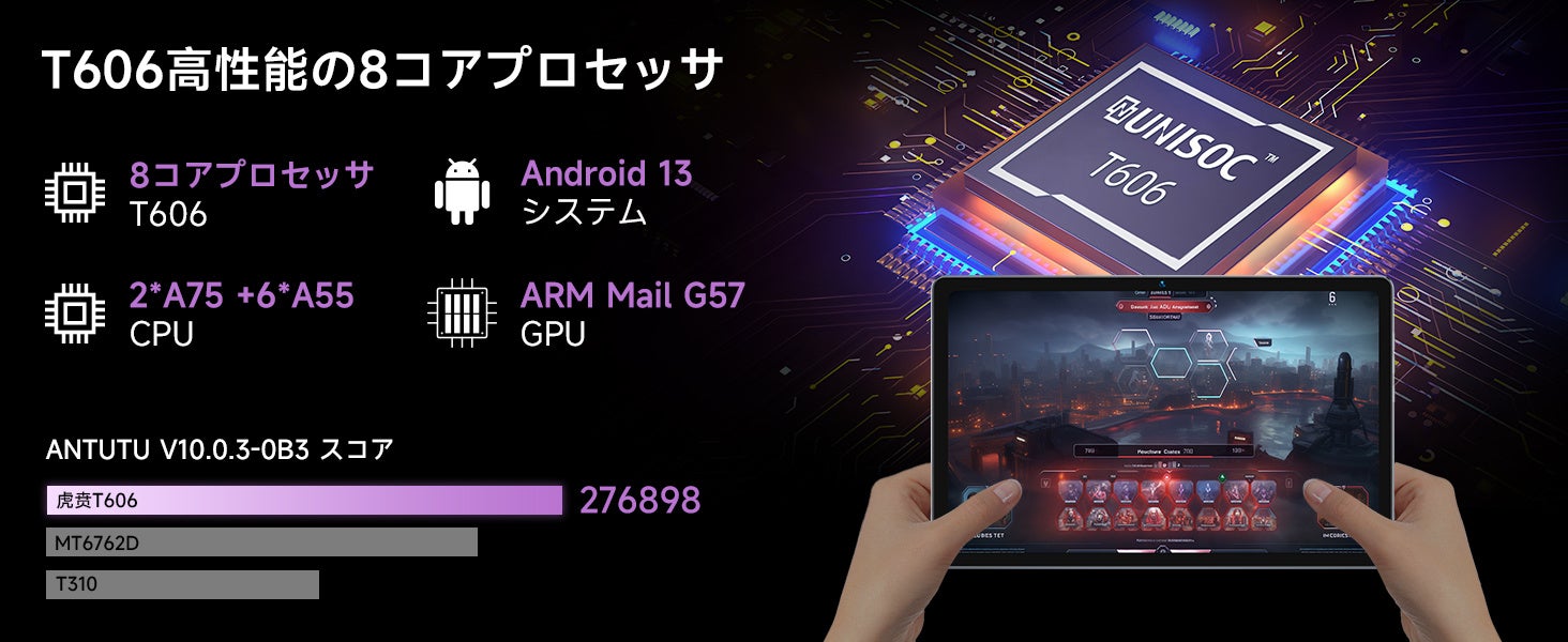 BMAXI11Plusタブレット は2つ大型コアA75と6つA55のUnisocT606CPUを搭載し、低消費電力の12nmプロセスで、低消費電力と低発熱を実現でき、様々な機能が強化されており、より軽快な動作と高速な処理が可能になります。 MaxPad I11Plus タブレットのAntutuベンチマークスコアは最高275,000点に達しております。