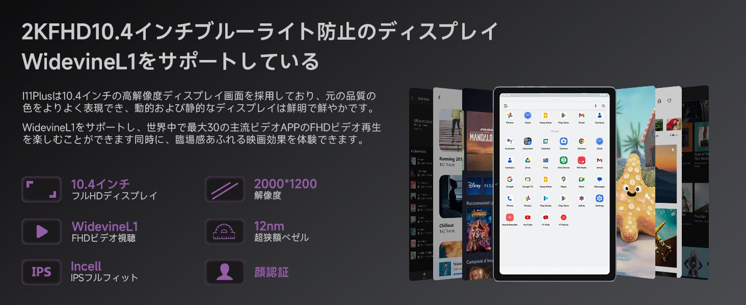MaxPad I11Plus タブレットは2000*1200IPS の10.4インチのディスプレイを採用し、従来より、画像はもっと鮮やかで表示します。2K 10.4インチタブレットはincellスクリーン処理技術を採用しており、良い画質を実現できます。10.4インチタブレットはWidevineL1をサポートしており、YouTube ビデオ、Disney+などが高画質で視聴可能であることを示しています。