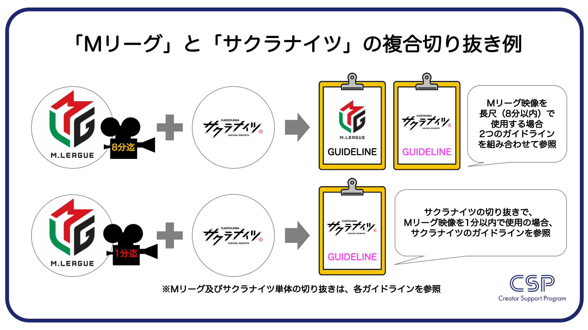 さらに、自社がもつプロ麻雀チーム「KADOKAWAサクラナイツ」の切り抜きガイドラインを併用することで、Mリーグ映像とKADOKAWAサクラナイツの映像を組み合わせた複合的な切り抜きを投稿することが可能です。