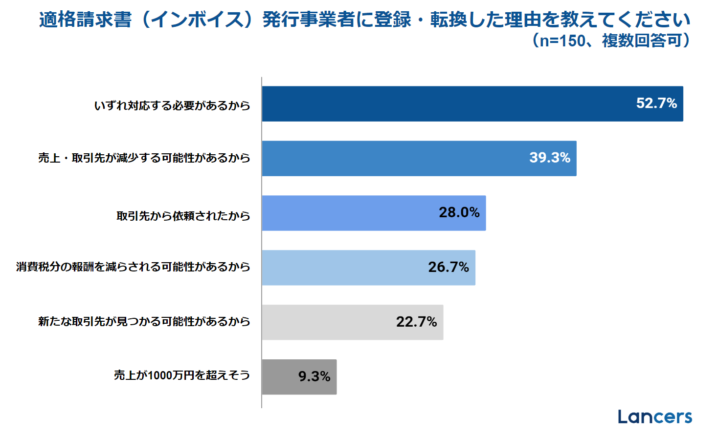 登録・転換した理由の上位3つは、「いずれ対応する必要があるから」、「売上・取引先が減少する可能性があるから」、「取引先から依頼されたから」