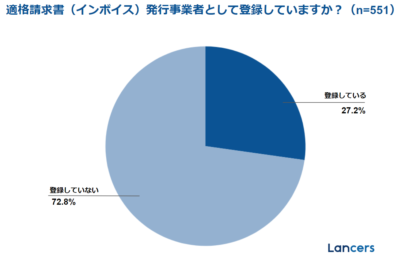 制度に対する認知や理解は進んでいる一方で、調査時点で適格請求書(インボイス)発行事業者に「登録している」は27.2%。7割以上のフリーランスが「登録していない」と回答。