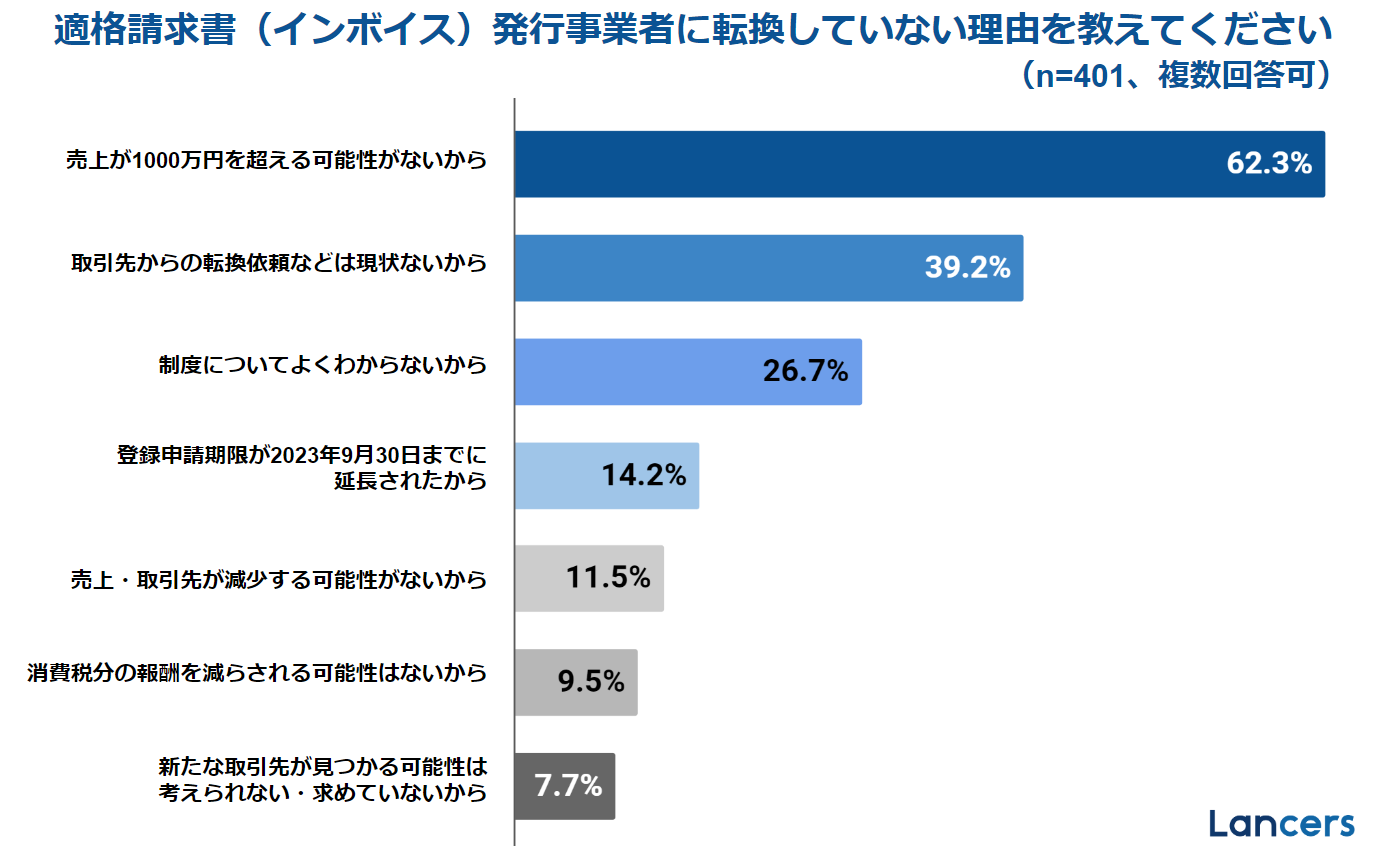 適格請求書(インボイス)発行事業者へ転換しない理由の上位3つは「売上が1000万円を超える可能性がないから」(62.3%)・「取引先からの転換依頼などは現状ないから」(39.2%)・「制度についてよくわからないから」(26.7%)。
