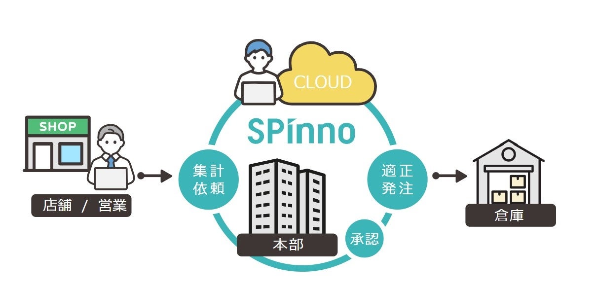 SPinnoは、販促物のデータ共有、デザイン制作・修正依頼、それらの申請の承認、活動ログ・販促物の注文データ管理、倉庫や印刷会社への出荷・発注依頼などの業務すべてが1つのシステム上で行えるクラウドサービスです。