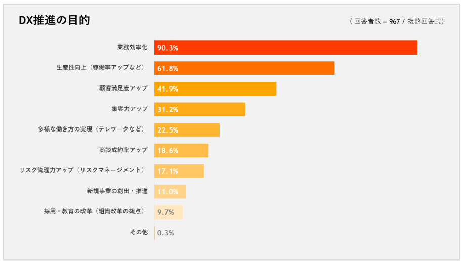 DXに取り組んでいる(いた) と回答した⼈に「その期間をお教えください」という質問をしたところ、「6ヶ⽉以上1年未満」が25.7%、「1年以上2年未満」が26.1%でボリュームゾーンでした。また、DX推進の⽬的について質問したところ、「業務効率化」が最も多く90.3%で、次いで「⽣産性向上」が61.8%、「顧客満⾜度アップ」が41.9%でした。