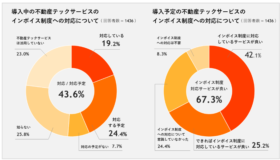 導⼊中の不動産テックサービスのインボイス制度への対応について質問したところ、「対応している」「対応する予定」の回答を合わせると43.6%でした。これから導⼊する不動産テックサービスについては 、「インボイス制度に対応しているサービスがいい」「できればインボイス制度に対応しているサービスがいい」の回答を合わせると67.3%でした。