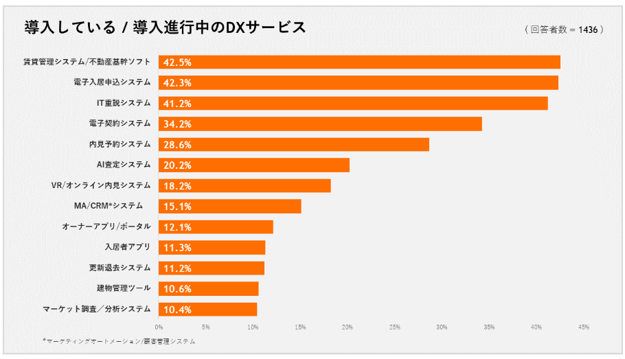 現在導⼊中または導⼊進⾏中の不動産テックシステムについて質問したところ「賃貸管理システム(不動産基幹ソフト)」が最も多く42.5%、次いで「電⼦⼊居申込システム」が42.3%、「IT重説システム」が41.2%、「電⼦契約システム」が34.2%でした。