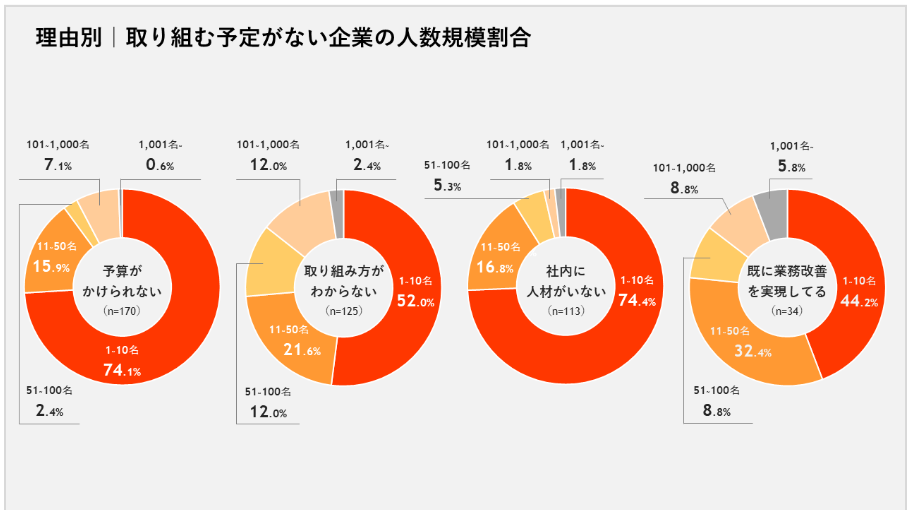 「DXに取り組む予定がない」理由は、従業員数が少ない企業では「予算がかけられない」「社内に⼈材 がいない」、従業員数が多い企業では「取り組み⽅が分からない」