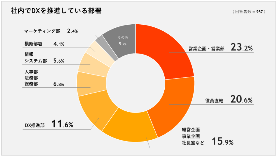DXを推進している部署について質問したところ、「営業企画・営業部」が23.2%が最も多く、次いで「役員直轄」が20.6%、「経営企画・事業企画・社⻑室など」が15.9%でした。