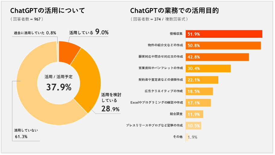 業務でChatGPTを「活⽤している」のはわずか1割、「検討している」は約3割。利⽤者は「情報収集」「物件の紹介⽂などの作成」「顧客対応や対応⽂の作成」などに活⽤