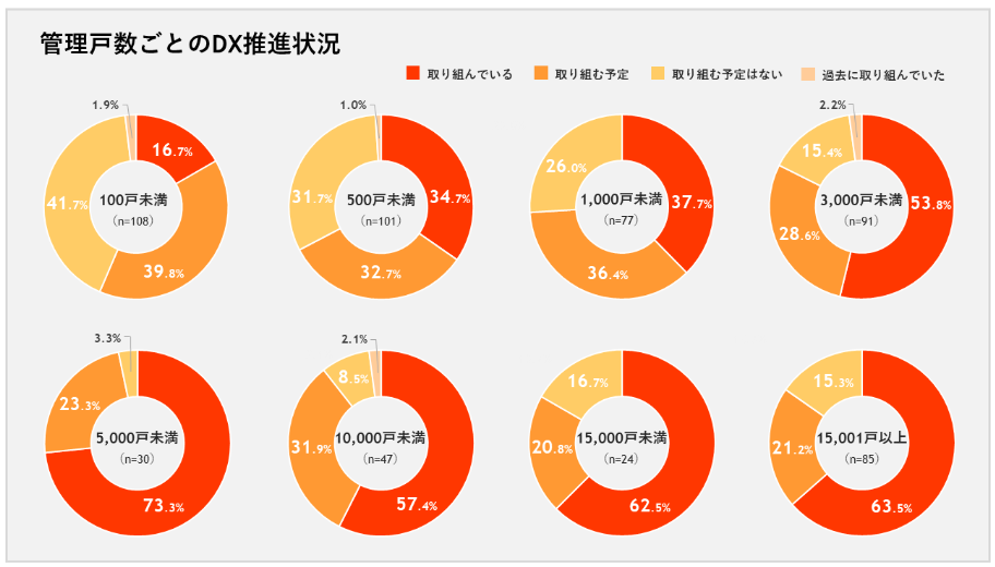 管理⼾数に⽐例して、通常業務で対応すべきことも増加するため、業務効率化を⽬的にしたDXがより求められます。⼀⽅で、企業規模が⼤きくなるにつれ、関わる⼈数も増えるため、DXを進めるのに時間が必要となります。管理⼾数3,000⼾以上5,000⼾未満の企業が最もDX推進に取り組んでいる割合が多いのは、管理⼾数が多いながらも⼩回りの効く企業規模で、DXを最も素早く進めやすい規模であるからなのかもしれません。