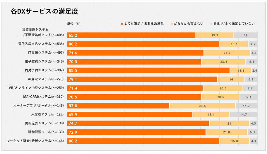 導⼊中の不動産テックサービスの満⾜度について質問したところ、「とても満⾜している/まあまあ満⾜している」の回答が最も⾼かったのは「内⾒予約システム」で85.5%、次いで「電⼦⼊居申込システム」「マーケット調査・分析システム」が同率で80.2%、「AI査定システム」が79.1%でした。