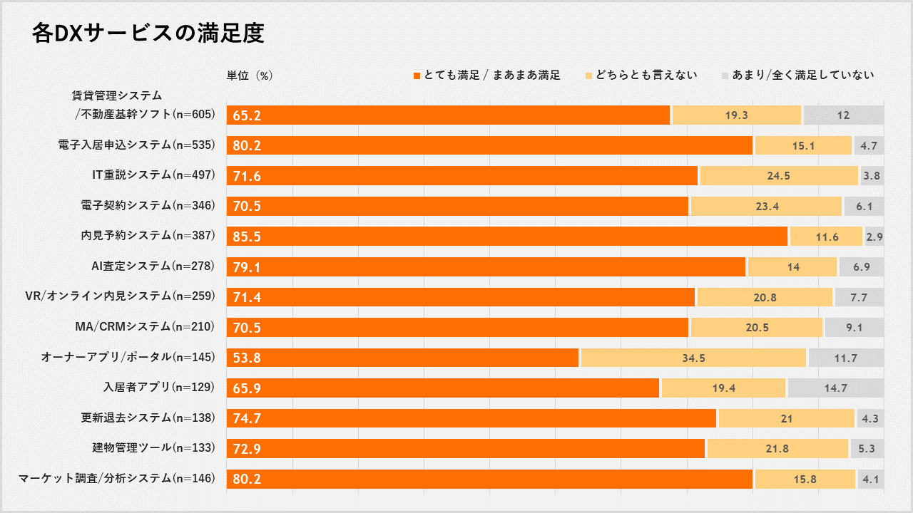 導⼊中の不動産テックサービスの満⾜度について質問したところ、「とても満⾜している/まあまあ満⾜している」の回答が最も⾼かったのは「内⾒予約システム」で85.5%、次いで「電⼦⼊居申込システム」「マーケット調査・分析システム」が同率で80.2%、「AI査定システム」が79.1%でした。