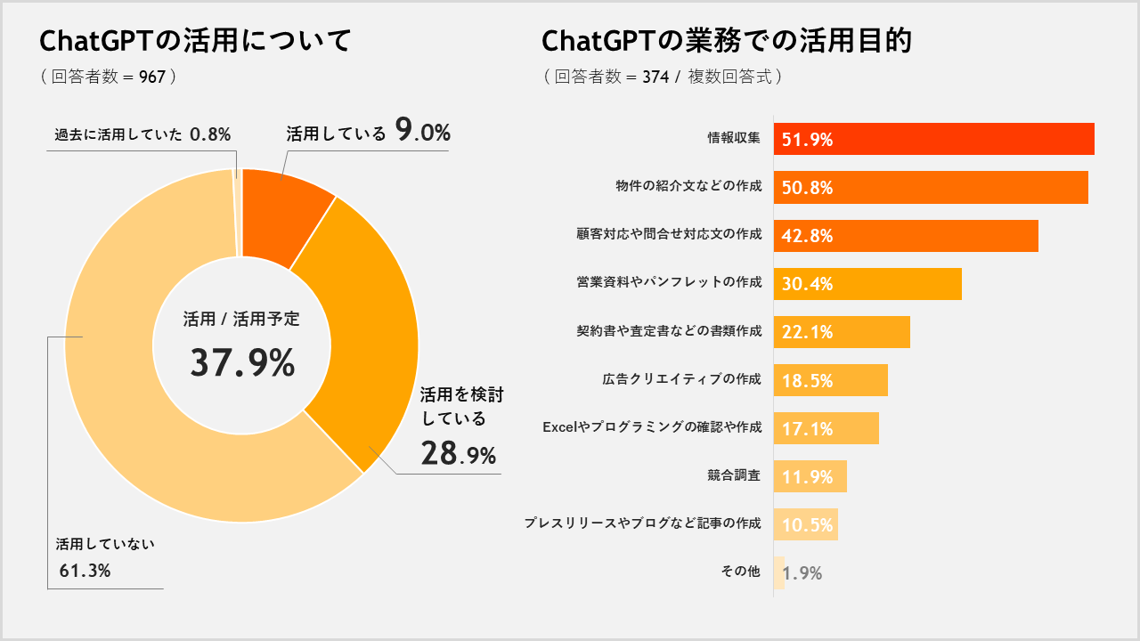 業務でChatGPTを「活⽤している」のはわずか1割、「検討している」は約3割。利⽤者は「情報収集」「物件の紹介⽂などの作成」「顧客対応や対応⽂の作成」などに活⽤