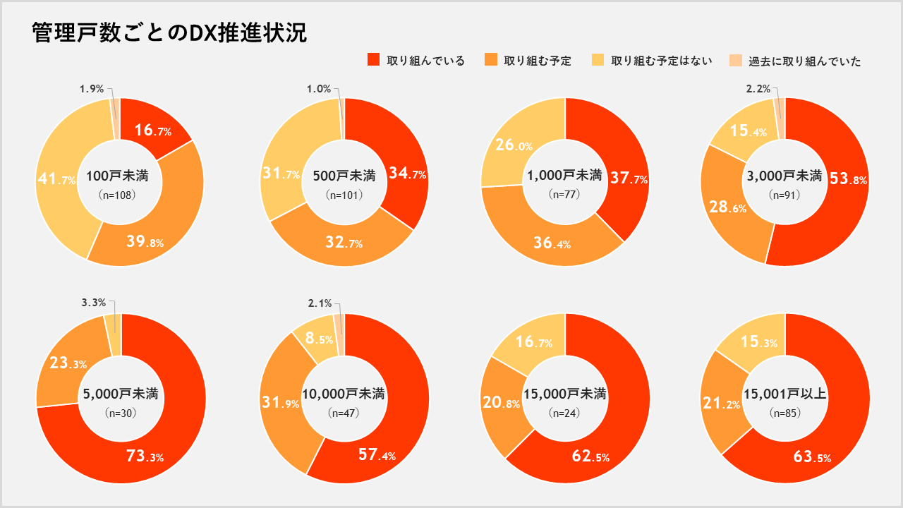 管理⼾数に⽐例して、通常業務で対応すべきことも増加するため、業務効率化を⽬的にしたDXがより求められます。⼀⽅で、企業規模が⼤きくなるにつれ、関わる⼈数も増えるため、DXを進めるのに時間が必要となります。管理⼾数3,000⼾以上5,000⼾未満の企業が最もDX推進に取り組んでいる割合が多いのは、管理⼾数が多いながらも⼩回りの効く企業規模で、DXを最も素早く進めやすい規模であるからなのかもしれません。