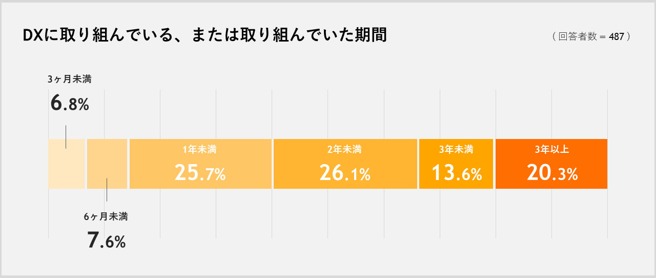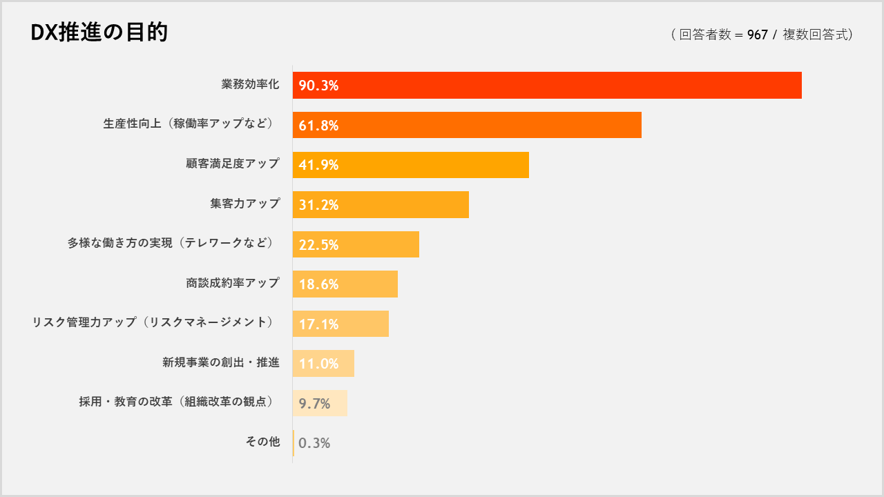 DXに取り組んでいる(いた) と回答した⼈に「その期間をお教えください」という質問をしたところ、「6ヶ⽉以上1年未満」が25.7%、「1年以上2年未満」が26.1%でボリュームゾーンでした。また、DX推進の⽬的について質問したところ、「業務効率化」が最も多く90.3%で、次いで「⽣産性向上」が61.8%、「顧客満⾜度アップ」が41.9%でした。