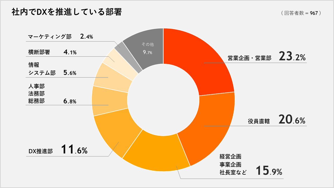 DXを推進している部署について質問したところ、「営業企画・営業部」が23.2%が最も多く、次いで「役員直轄」が20.6%、「経営企画・事業企画・社⻑室など」が15.9%でした。