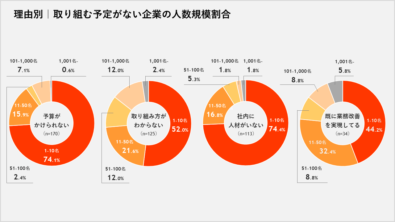 ◆ 「DXに取り組む予定がない」理由は、従業員数が少ない企業では「予算がかけられない」「社内に⼈材がいない」、従業員数が多い企業では「取り組み⽅が分からない」