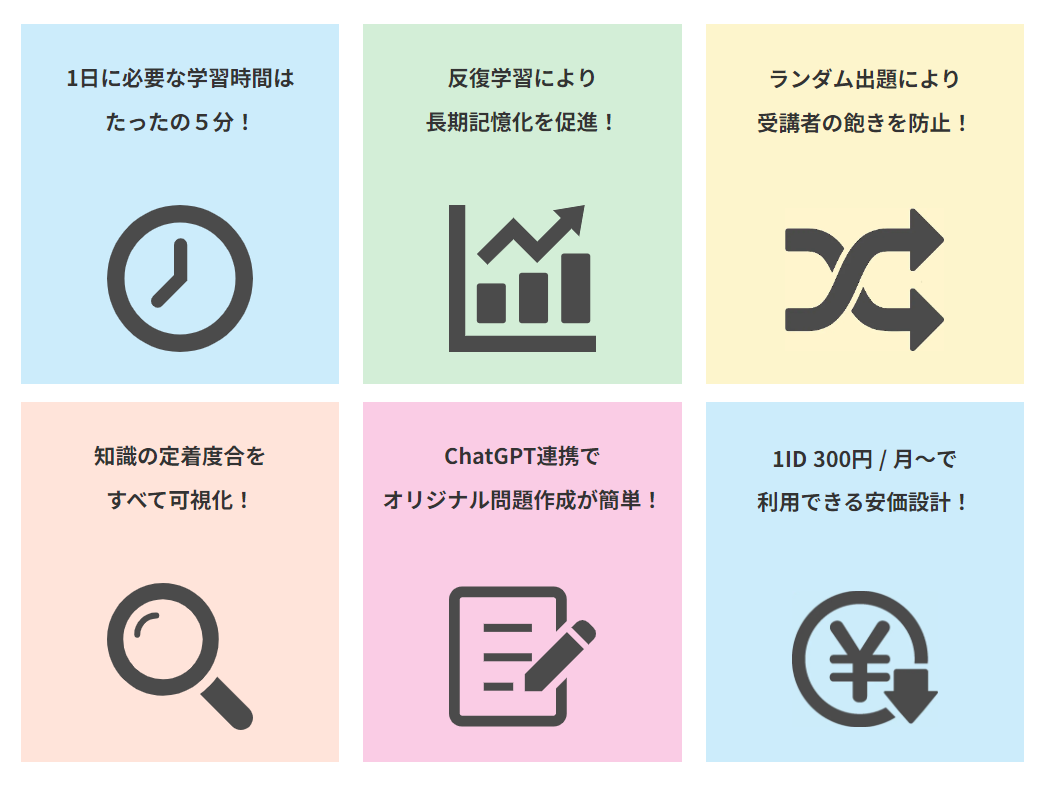 kokoroeは1日5分のテストを毎日繰り返すことで学習を習慣化させ、長期記憶化にアプローチします。