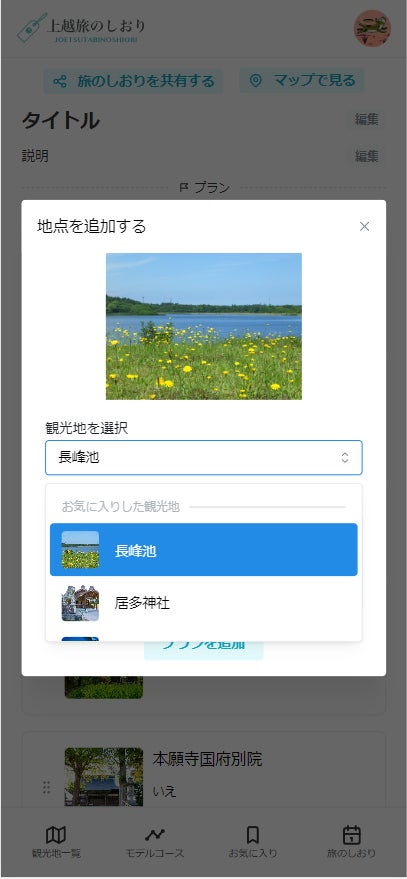 おすすめの観光地やルート(モデルコース)から、旅程を作成することができるアプリ。作成した旅程はグループで共有や編集もできる。WEB広告やセキュリティなど、ビジネス利用を想定した仕組みも。