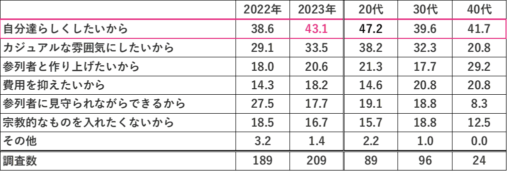 人前式を選んだ理由で最も多かったのは、「自分たちらしくしたいから(43.1%、前年比+4.5pt)」で、“自分らしさ”を重視する傾向から今後も「人前式」の需要拡大が予想される。【図6】