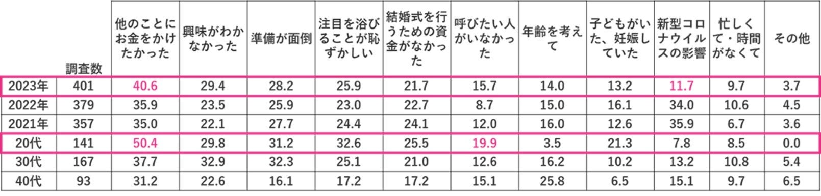 結婚式を挙げない理由を聞いたところ、「他のことにお金をかけたかった(40.6%)」が前年に続き最も多かった。前年2番目に多かった「新型コロナウイルスの影響(11.7%)」については、前年比-22.3ptと大幅に減少し、結婚式の開催有無にコロナ禍が与える影響は少なくなったことがわかる。また、年代別では、20代で「呼びたい人がいなかった(19.9%、22年比+11.2pt)」が前年に比べ増加幅が最も大きく、次いで、「他のことにお金をかけたかった(50.4%、22年比+8.1pt)」となった。物価高騰の影響やコロナ禍を経て交友関係にも変化があったことが推察される。【図2】