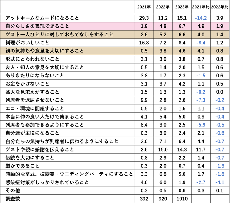 結婚式で最も重視したことについて聞くと「自分らしさを表現できること」6.7%(21年比:+4.9pt、22年比:1.9pt)が2年連続で増加した。コロナ発生前から発生直後に結婚した男女を対象にした2021年調査は、「アットホーム、料理がおいしい、列席者を退屈にさせない」など、“おもてなし”を重視する傾向があったが、2023年は「自分らしさ」も表現する傾向に変化してきているようだ。【図4】