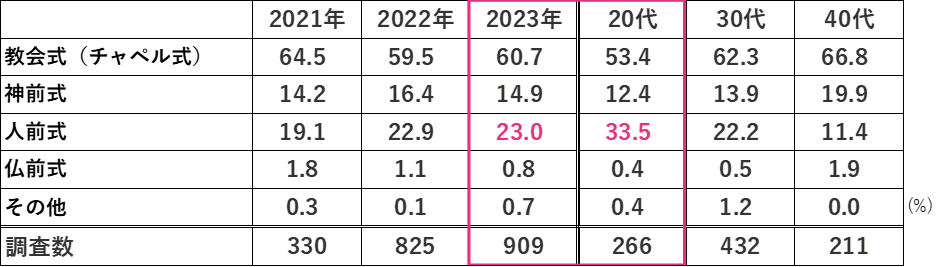 また、挙式スタイルについて聞いてみると、「教会式」が60.7%で最も多く、次いで「人前式」が23.0%となった。「人前式」は、この2年間で3.9pt増加しており、特に20代では3割を超え、全体比+10.5ptとなった。【図5】