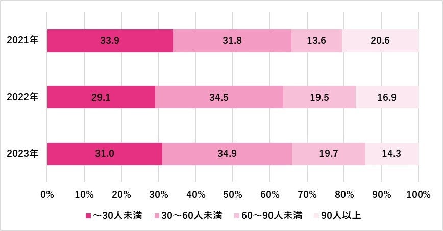 結婚式を行った(「挙式・披露宴どちらも行った」「披露宴・ウエディングパーティのみ行った」)人の招待人数は平均51.7人(前年比-2.2人)だった。招待人数別に前年との増減をみると、招待人数が少なく規模が小さい式は増加し、規模の大きい「90名以上:14.3%(21年比:-6.3pt、22年比:-2.6pt)」の式のみ3年連続減少となった。交友関係の変化も影響し、規模の大きい式の需要は低迷が続く見込みだ。【図3】