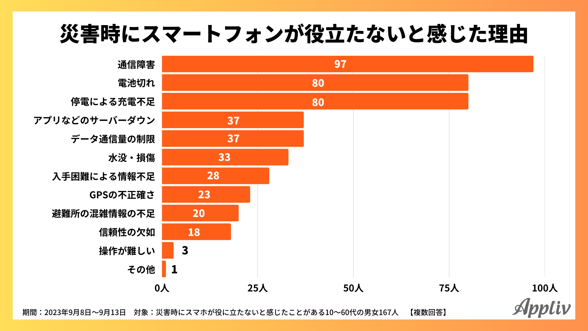 災害時にスマートフォンが役に立たないと感じた理由で、最も多かったのは「通信障害(97人)」、次いで「電池切れ(80人)」「停電による充電不足(80人)」という結果でした。