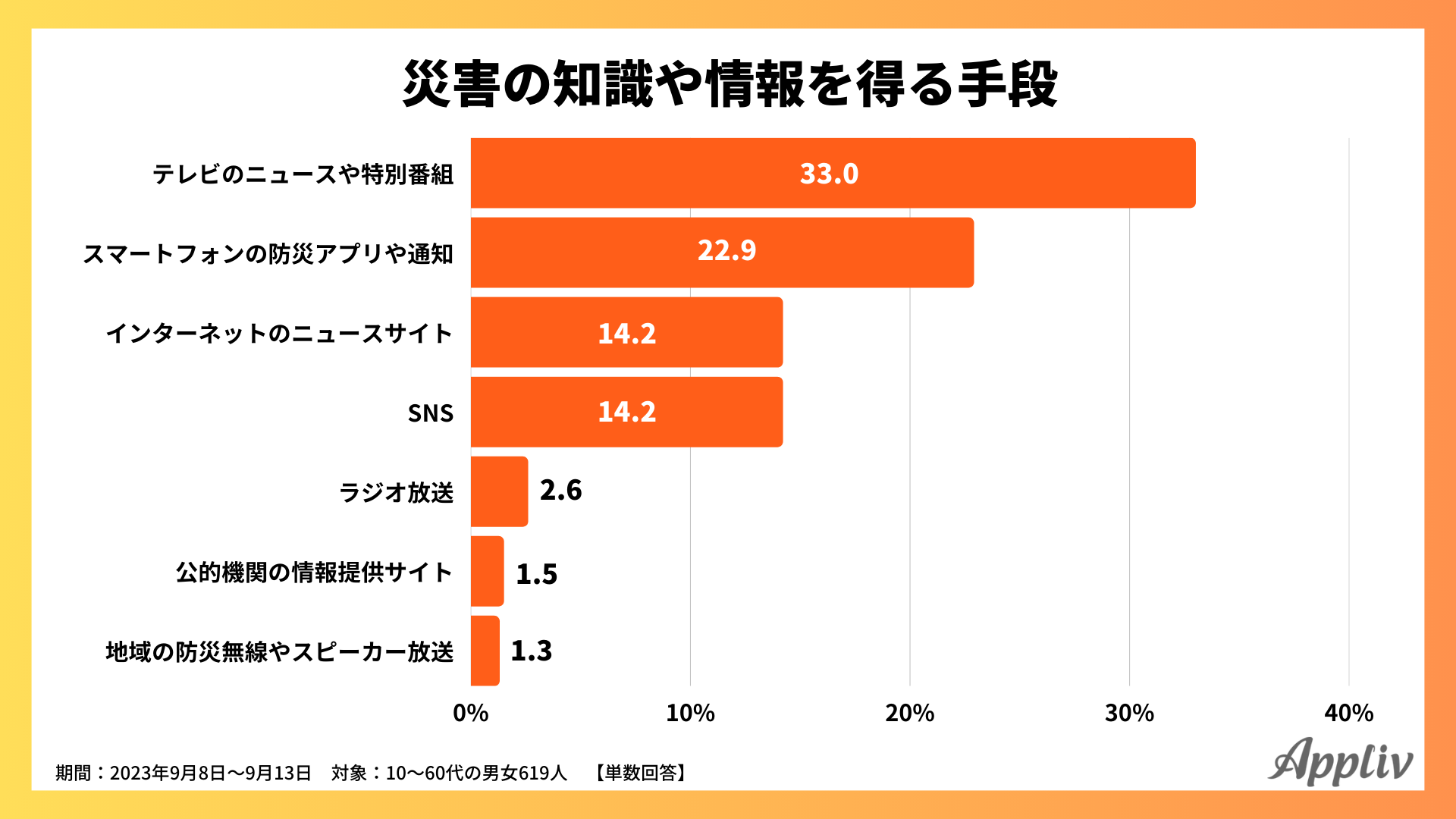 災害に関する知識や情報をリアルタイムで得る手段を尋ねたところ、最も多いのは「テレビのニュースや特別番組(33.0%)」、次いで「スマートフォンの防災アプリや通知(22.9%)」、「インターネットのニュースサイトやポータルサイト(14.2%)」「SNS(ソーシャルネットワーキングサービス)(14.2%)」という結果でした。