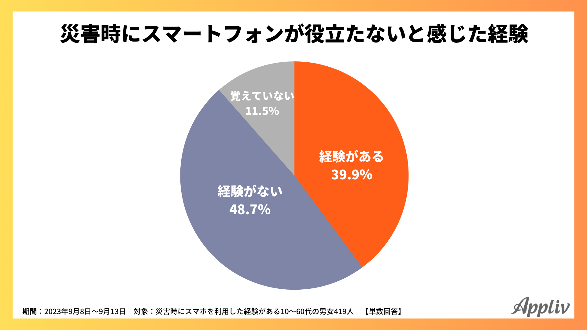 続いて、災害時にスマートフォンが役に立たないと感じた経験を調べてみると、経験があると回答したのは39.9%でした。経験がないと回答したのは48.7%となっています。