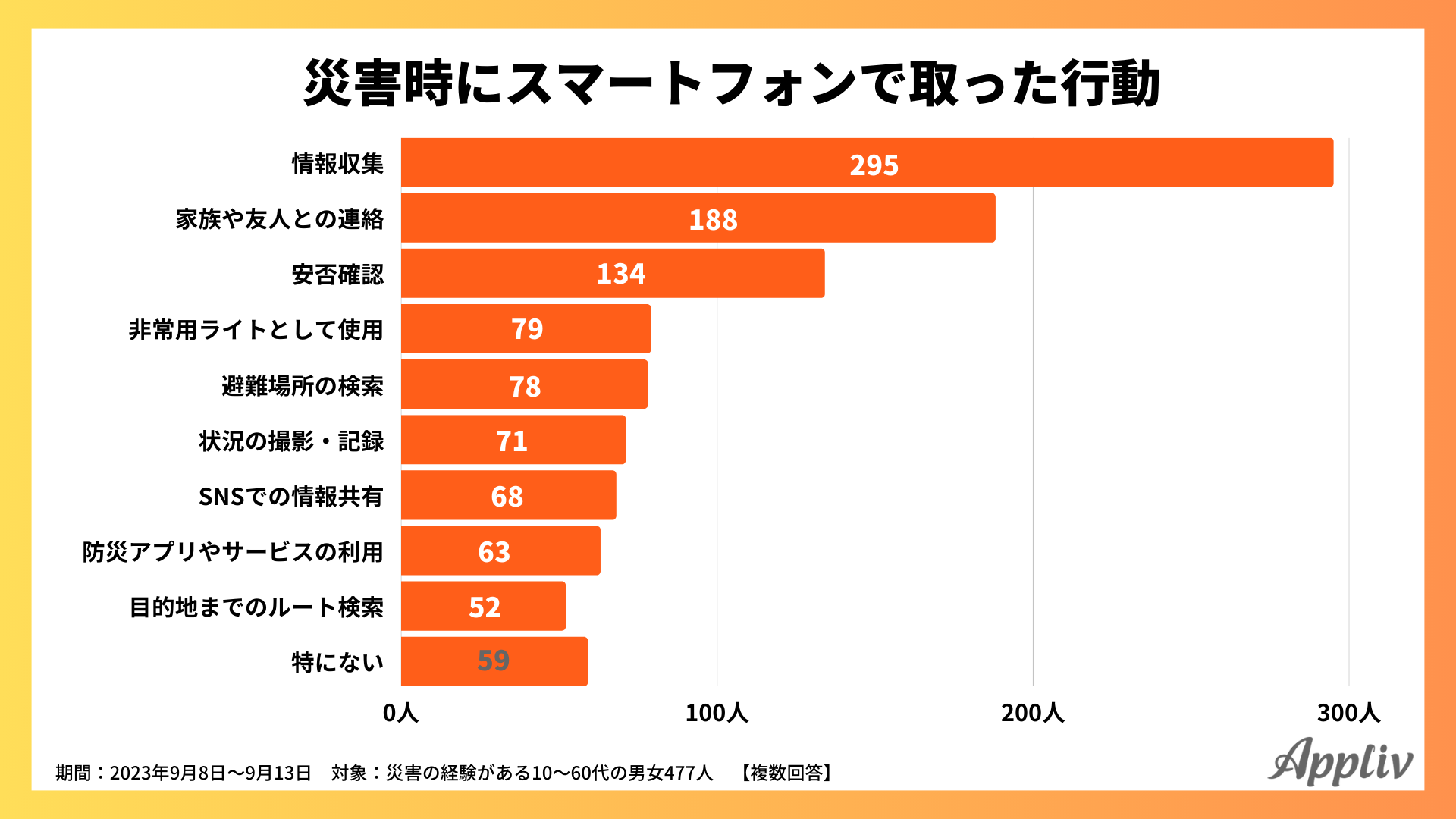 災害時にスマートフォンで取った行動について聞いた結果、「情報収集(295人)」が最も多く、次いで「家族や友人との連絡(188人)」、「安否確認(134人)」となりました。